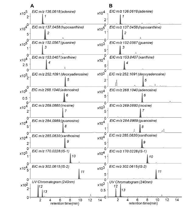 案例七、LC-MS方法分析人尿中10種嘌呤和肌酐