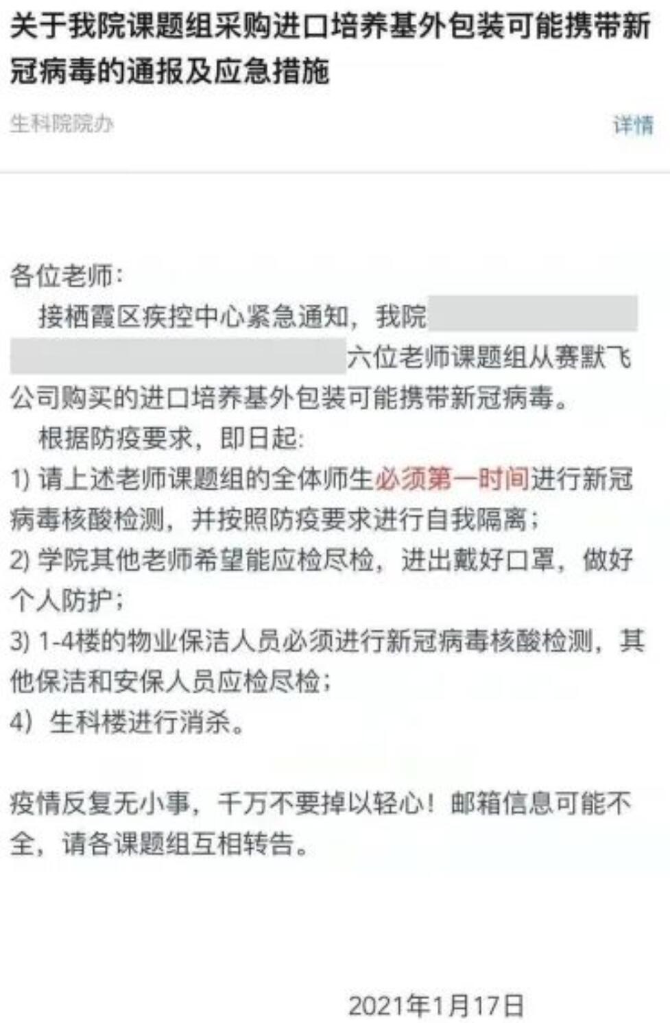 南京某高校群發(fā)郵件通知,該校生科院部分課題組采購的進口培養(yǎng)基外包裝可能攜帶新冠病毒,并要求這些課題組全部成員接受核酸檢測、自我隔離。
