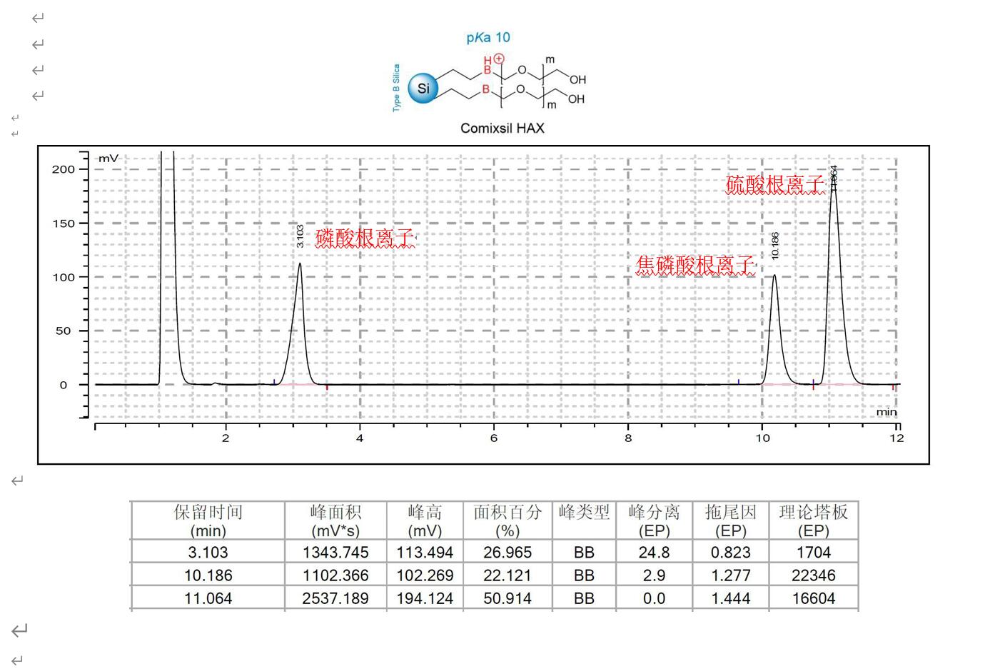 方法說明:通過 Comixsil HAX 的中等強度的陰離子交換能力保留各陰離子,通過酸的濃度調(diào)節(jié)各陰離子的保留,解決了在其他固定相上比較難解決的焦磷酸根離子的保留和峰形問題。Comixsil HAX 在高比例有機相條件下也存在強的 HILIC 作用,在本應用中,為了避免過強的保留,只發(fā)揮其陰離子交換的作用。