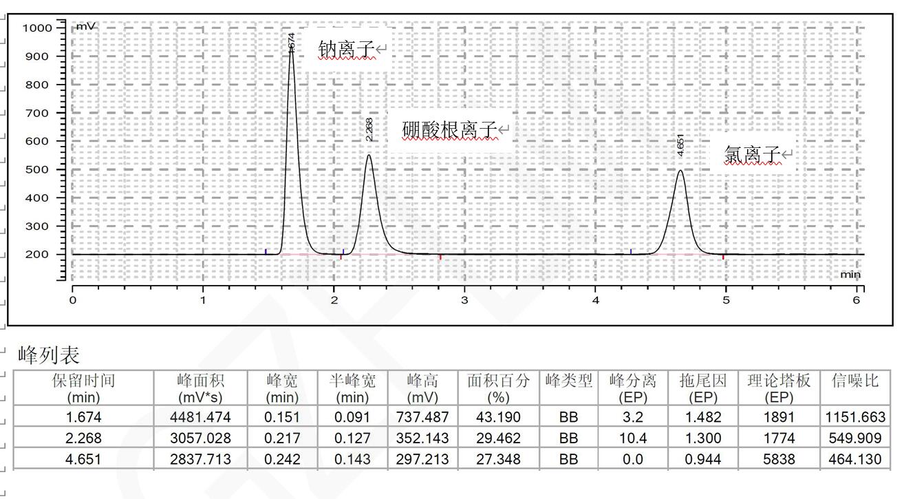 方法說明:使用 Comixsil RP-AX ,利用陰離子交換保留硼酸根離子和氯離子,鈉離子由于陽(yáng)離子排