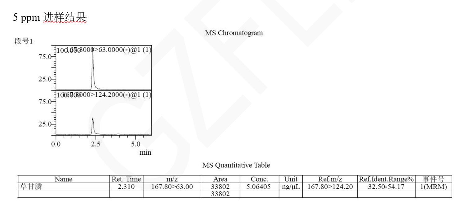 說明:本方法研究草甘膦不衍生直接檢測(cè)。相比于傳統(tǒng)衍生后用 C18 分析,或者用氨基柱不衍生 PH=10-11 條件下分析,帶來的復(fù)雜,耗時(shí),以及氨基柱結(jié)果重現(xiàn)與壽命上的問題。此方法簡(jiǎn)單,快速,方便。可滿足常規(guī)分析檢測(cè)需求以及多數(shù)殘留檢測(cè)需求。