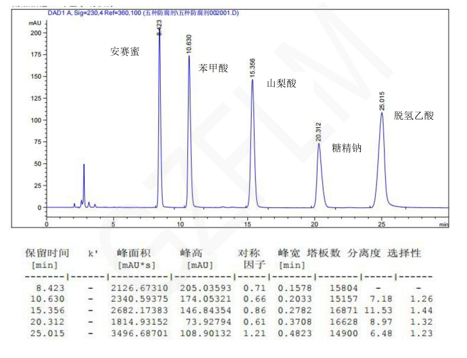 安賽蜜、苯甲酸、山梨酸、糖精鈉和脫氫乙酸五種防腐劑的同時(shí)檢測(cè)