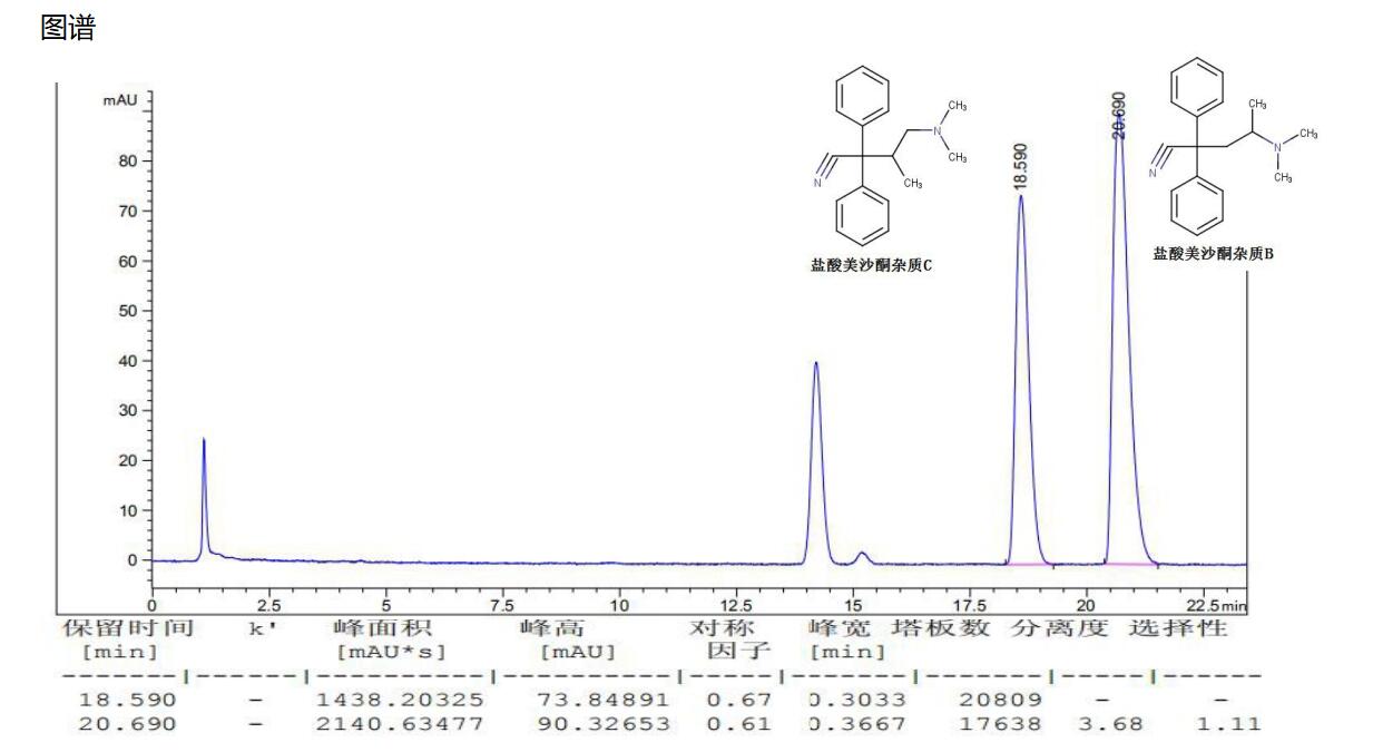 方法說明:鹽酸美沙酮雜質 B、C 在結構上屬于同分異構體,酸性條件下拖尾嚴重且無法分離,使用耐堿性的 Titank C18,在堿性條件下可以將兩者分離,且峰型良好。