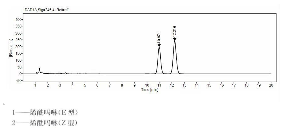 烯酰嗎啉: 流動(dòng)相:乙腈:0.1%磷酸水=40:60 波長:254nm 色譜圖: