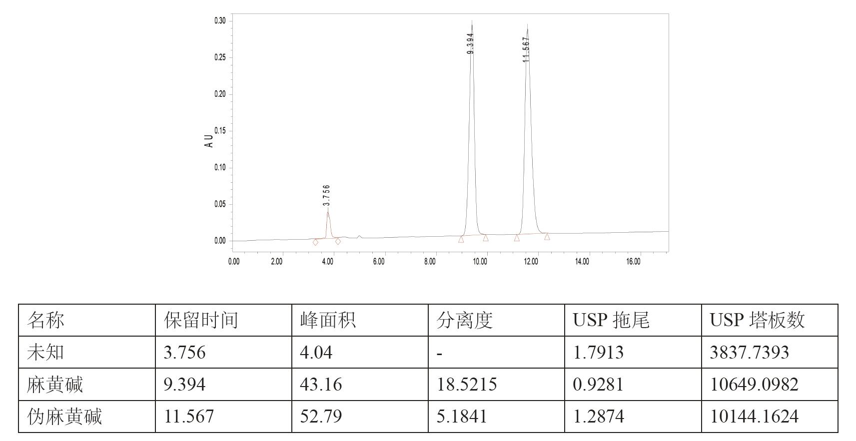 參照 2015 版中國藥典麻黃檢測色譜條件:以極性乙醚連接苯基鍵合硅膠為填充劑;以甲醇-0.092% 磷酸溶液(含0.04% 三乙胺和 0.02% 二正丁胺)(1.5: 98.5)為流動相;檢測波長 210 nm;理論塔板數(shù)按鹽酸麻黃堿峰計算應不低于3000。