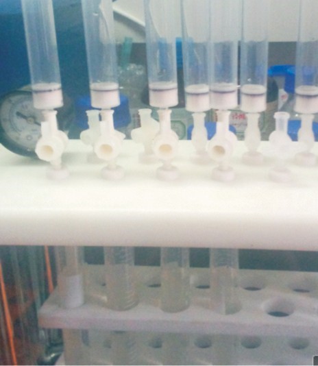 (2) 在機械震蕩器上震蕩3 h, 萃取 Cr6+ 。 (3)萃取完成后,通過薄膜濾器將錐形瓶中的溶液過濾,待凈化。檢查溶液的pH值,應為7.5 - 8.0,如果不在此范圍,則需重新提取。