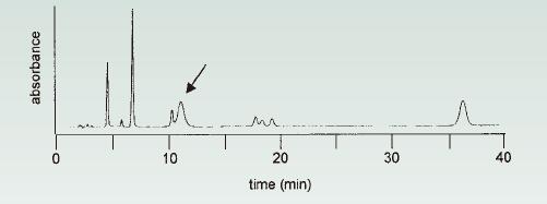 對于等度分離,保留時間越長,峰應(色譜峰)越寬;但色譜圖狹窄區域內的所有峰應具有大致相同的峰寬。如圖11(箭頭)所示,當窄峰中出現寬峰時,可能是因為之前注射(前次進樣)的化合物發生了洗脫延遲。這很容易檢查。