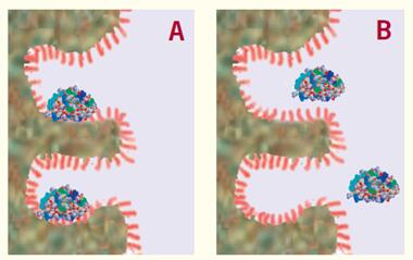 圖4. 進入色譜柱的蛋白質(zhì)被吸附在柱頂端附近的疏水表面上(A)并且一直保持吸附,直至有機改性劑的濃度達到特定值,此時蛋白質(zhì)從表面解吸附(B)。